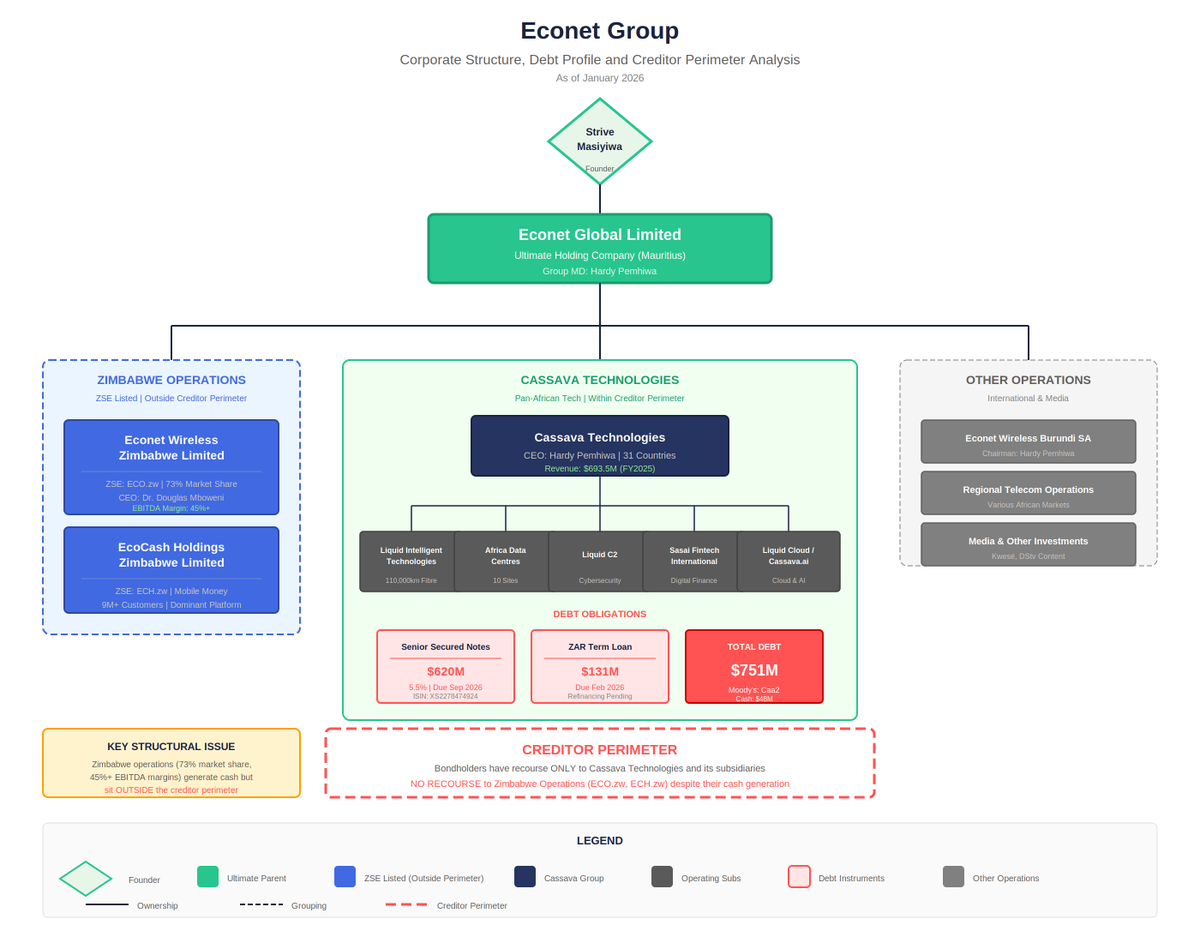 The entire structure appears to depend on cash from Econet Wireless Zimbabwe, a separately listed company that sits outside the creditor perimeter. Bondholders owed USD 751 million have no direct claim on the only asset generating real money.